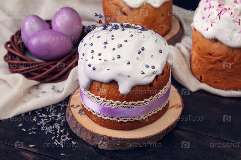 Пасхальные торты на темном фоне, украшенные лавандой и зефирами, а также окрашенные пасхальные яйца в плетеновое гнездо