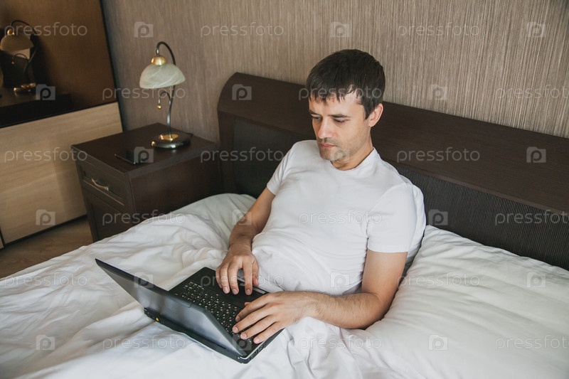 Мужчина средних лет сидит в постели в своей спальне и работает на ноутбуке