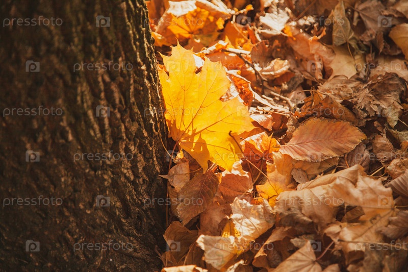 Желтый кленовый лист на фоне упавших листьев освещается закатом