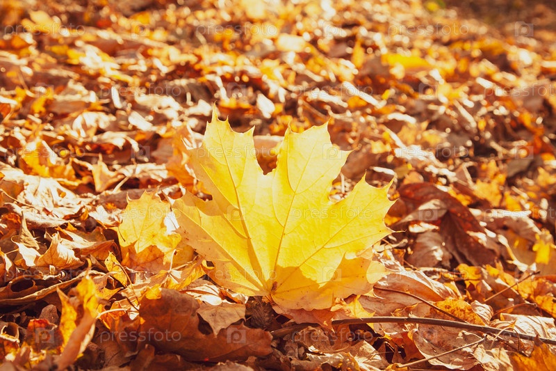 Падающий желтый кленовый лист на фоне упавших листьев освещается закатом солнца в парке, копирует пространство