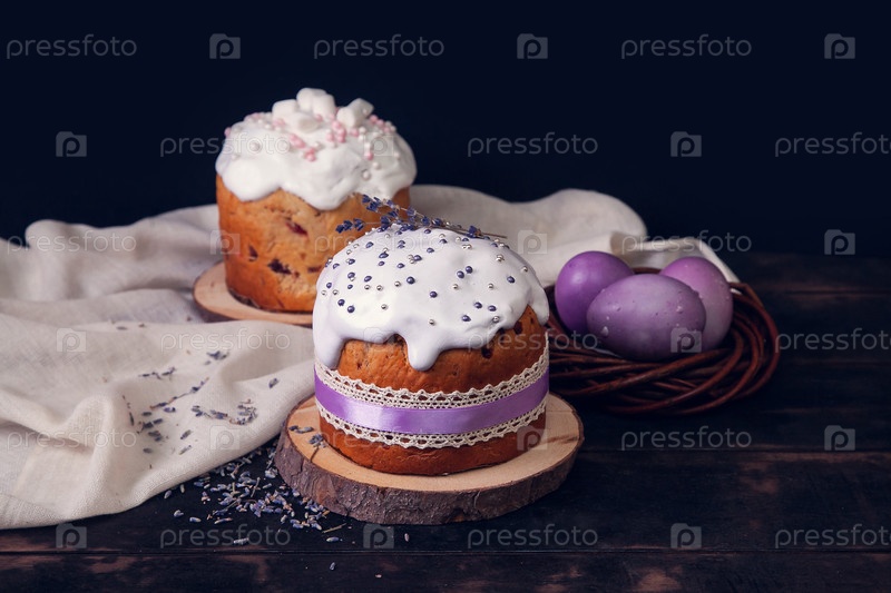 Пасхальные торты на темном фоне, украшенные лавандой и зефирами, а также окрашенные пасхальные яйца в плетеновое гнездо
