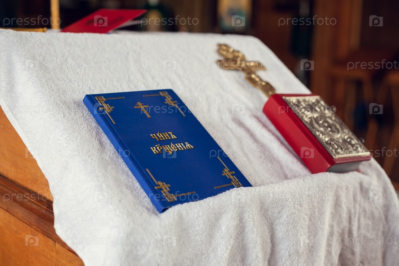 Таинство Крещения в православной церкви. молитвенники и распятие на столе. надпись на книге: обряд крещения