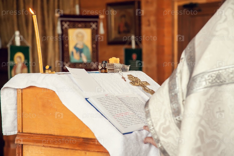 Священник держит книгу для чтения молитв во время обряда крещения в православной церкви