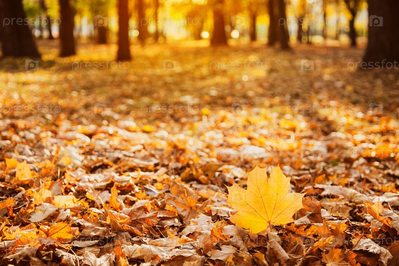 Падающий желтый кленовый лист на фоне упавших листьев освещается закатом солнца в парке, копирует пространство