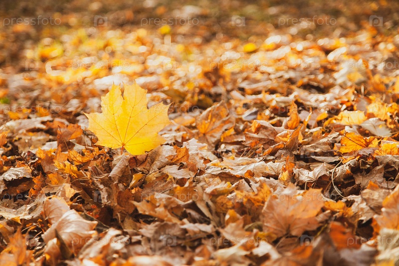 Падающий желтый кленовый лист на фоне упавших листьев освещается закатом солнца в парке, копирует пространство