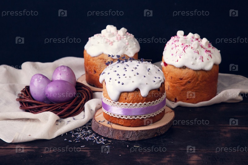Пасхальные торты на темном фоне, украшенные лавандой и зефирами, а также окрашенные пасхальные яйца в плетеновое гнездо