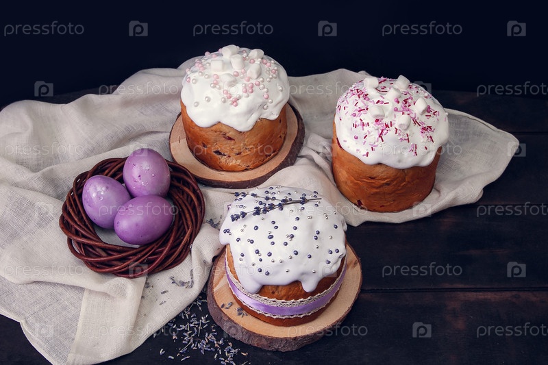 Пасхальные торты на темном фоне, украшенные лавандой и зефирами, а также окрашенные пасхальные яйца в плетеновое гнездо