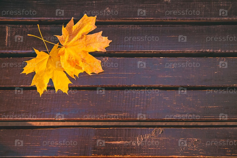 Желтые кленовые листья упали на коричневую деревянную скамейку в городском парке