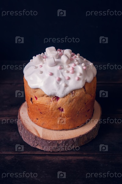 Пасхальные торты на деревянном стенде, украшенные зефиром, темный фон