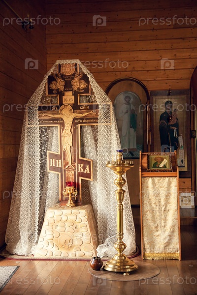 Большой крест с распятием Иисуса Христа, светильники и иконы в Православной Церкви