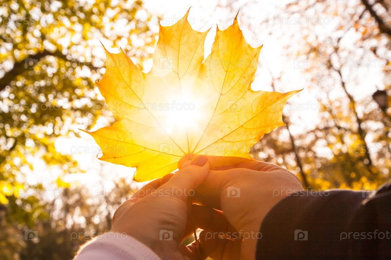 Руки мужчины и женщины держат кленовый лист с дырой, через которую солнце светит в парке