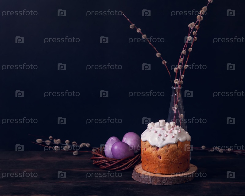 Пасхальные торты на темном фоне, украшенные зефирами и окрашенными пасхальными яйцами в плетеновое гнездо