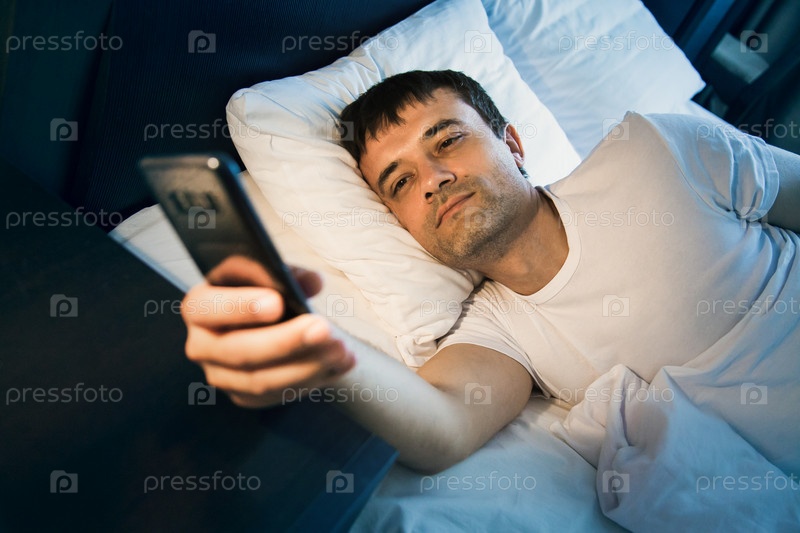 Мужчина просыпается в постели и смотрит на свой телефон, выключает будильник и смотрит время, серфирует по интернету, читает сообщения