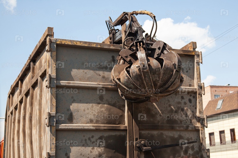 Грязный окрашенный грузовик с гидравлическим манипулятором для сбора и транспортировки металлолома