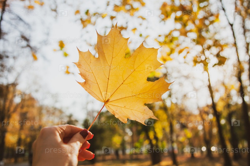 Молодая женщина держит желтый осенний кленовый лист в парке