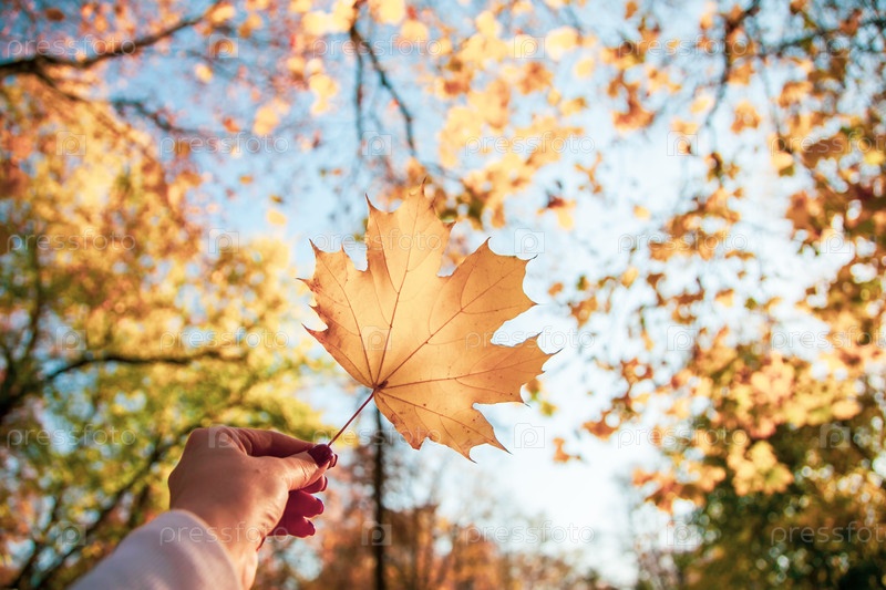 Молодая женщина держит желтый осенний кленовый лист в парке
