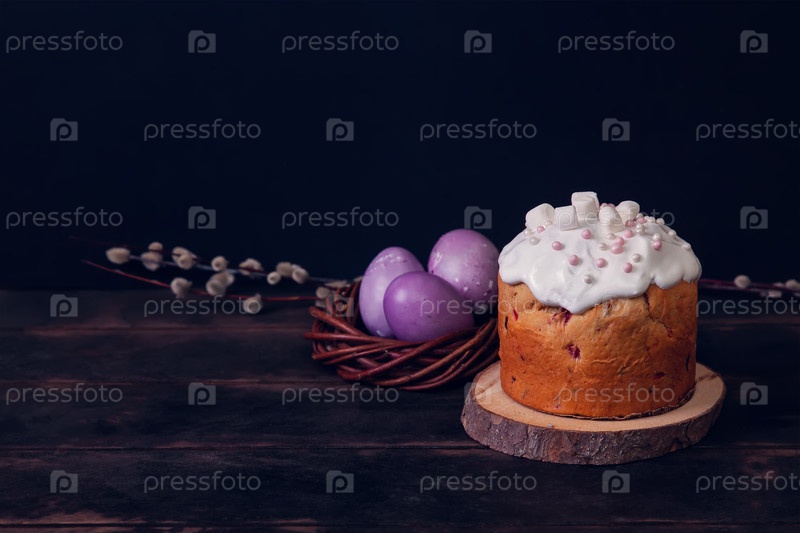 Пасхальные торты на темном фоне, украшенные зефирами и окрашенными пасхальными яйцами в плетеновое гнездо