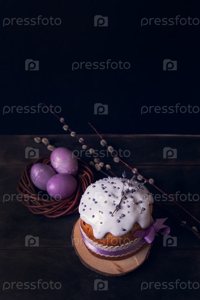 Пасхальные торты на темном фоне, украшенные лавандой и зефирами, а также окрашенные пасхальные яйца в плетеновое гнездо