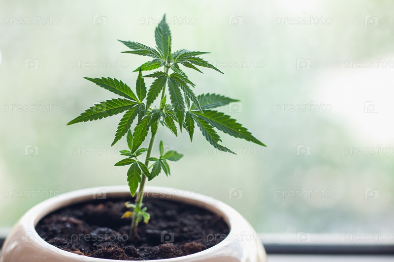 Выборочный фокус каннабиса в цветочном горшке на подоконнике, размытый фон