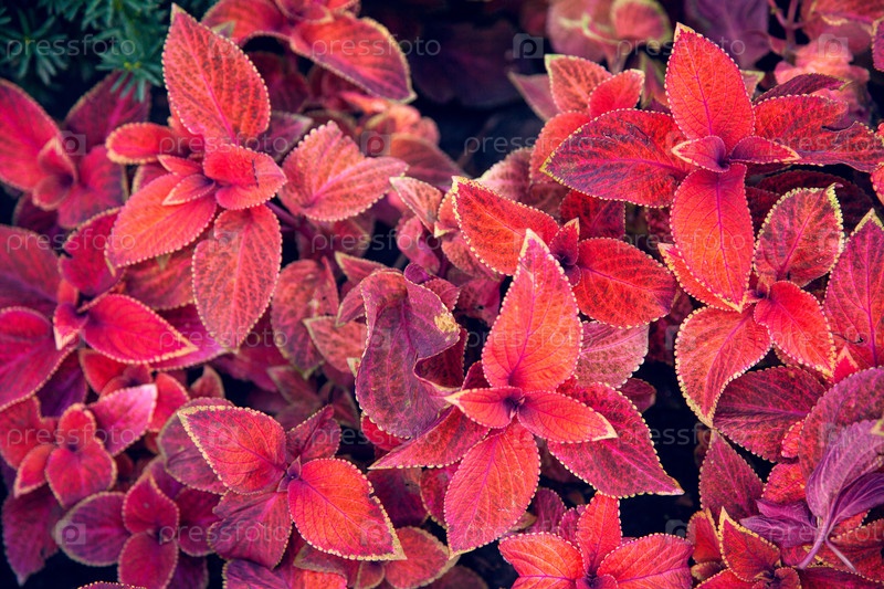 Красный и фиолетовый фон листьев близко, яркий цвет пышной текстуры листочков. абстрактное естественное рисование