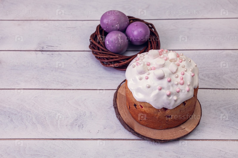 Пасхальные торты украшали зефирами, а пасхальные яйца рисовали в плетеновом гнезде на светлом деревянном фоне, вид сверху копировал пространство