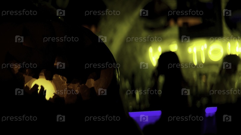 Хэллоуин жуткие тыквы в темном баре. резервные кадры. закрыть страшную тыкву с желтой лампой внутри и повеселиться на заднем плане