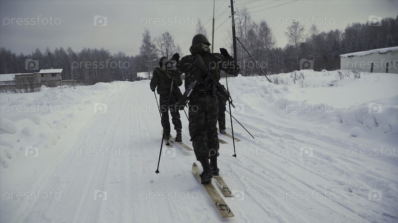 Группа солдат, катающихся на лыжах в лесу с оружием. Солдаты с автоматами АК-47 и гранатометами бегают по зимнему лесу на лыжах. Солдаты тренируются в лесу зимой. Зимняя война и военная концепция
