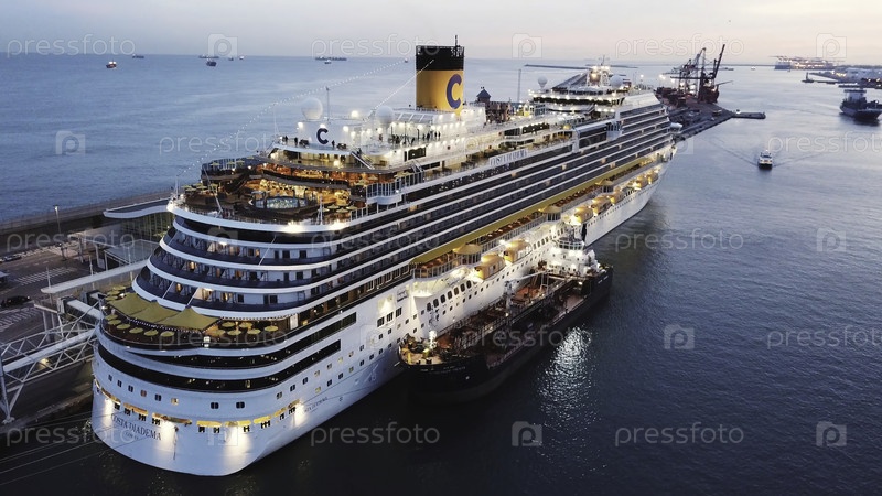 Вид на верхнюю палубу роскошного круизного лайнера рядом с пиром со многими людьми на борту, отдыхающими, играющими в баскетбол и гуляющими