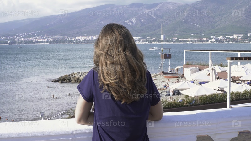Обратный вид молодой женщины на фоне пляжа, моря и гор. СМИ. Красивая женщина стоит на набережной с видом на пляж с туристами и горами в солнечный день