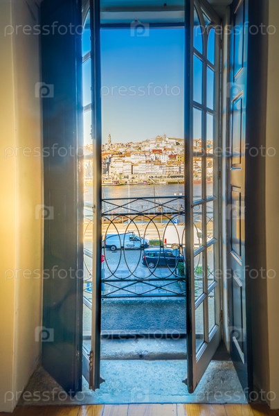 Из окна открывается живописный вид на старый город Порту, Португалия - туристический средиземноморский город