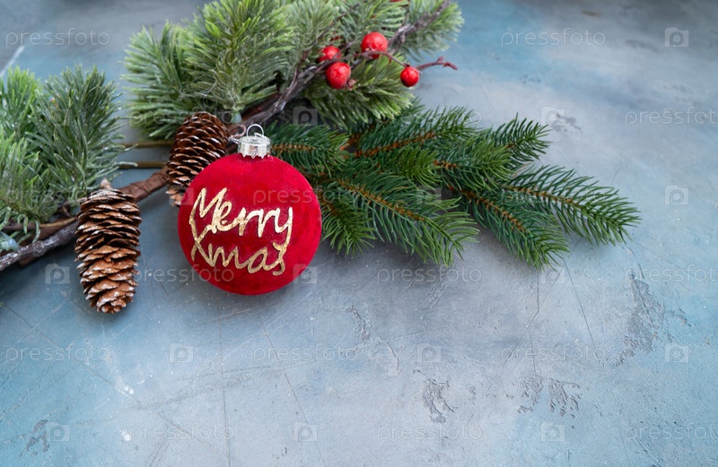 Красная капуста с сценарием 'Веселые Рождества' расположена среди морозных ветвей сосны и соснового конуса, текстурированный сине-серый фон и теплые тона создают ностальгическую сезонную сцену