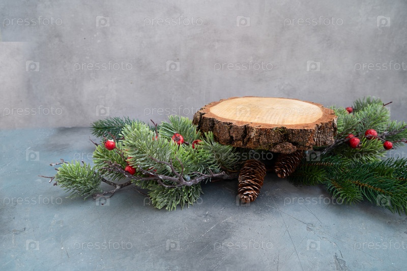Деревянный резкий пьедестал с сосновыми ветвями и морозными ягодами, естественная основа коры на нейтральной бетонной поверхности, деревенская демонстрационная сцена, идеально подходит для стиля продукта, ремесла