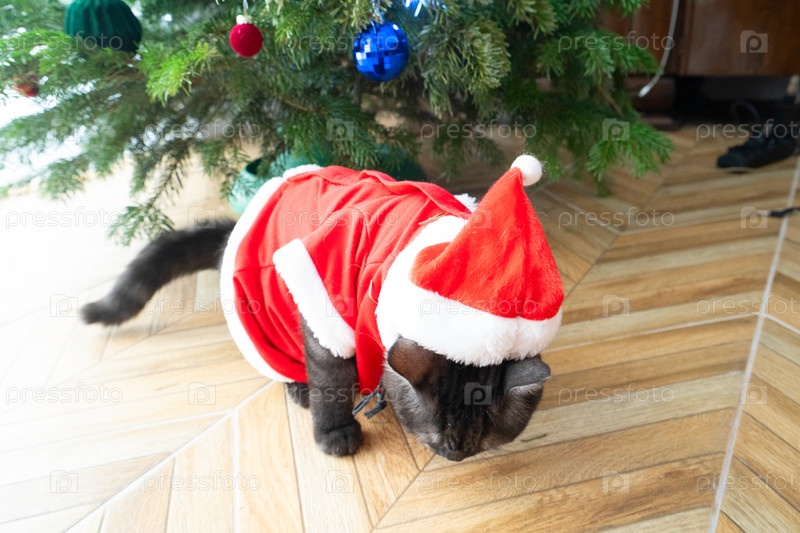 Красивый серый кот, носящий праздничную шляпу Санты среди красивых украшений сезона