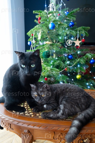 Красивые серые и черные кошки в праздничной шляпе Санта-Клауса спокойно дремлют среди красивых сезонных украшений