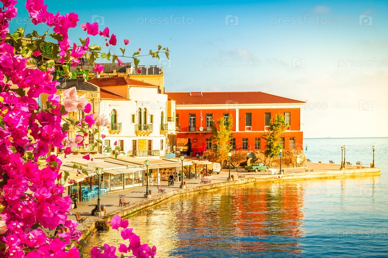 Знаменитый венецианский порт на причале старого города Хании, Крит, Греция с цветами