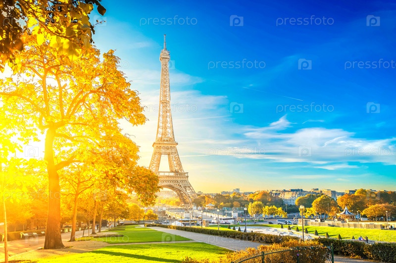 Вид на Эйфелеву башню с Трокадеро на рассвете, Париж (Франция), оттененный