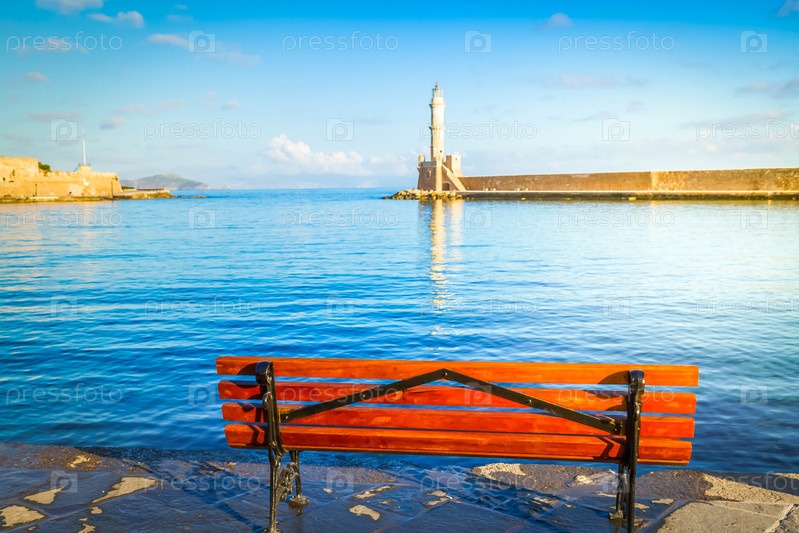 Хания Венецианская гавань с скамейкой и маяком в солнечный день, Крит, Греция