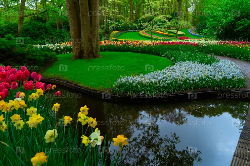 Красочный пруд в саду тюльпанов, показывающий яркие цветы в пышной обстановке