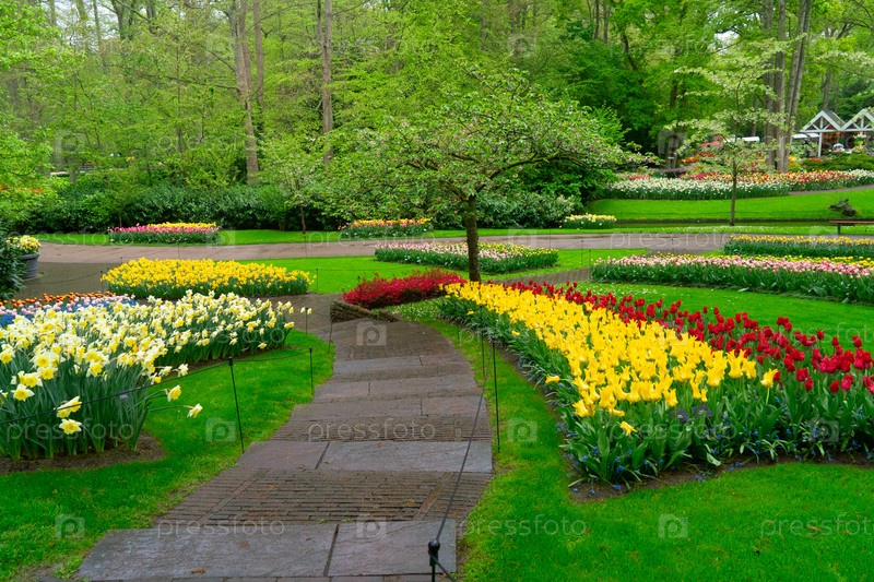 Путь через яркий сад тюльпанов в полном цветении во время восхитительного весеннего сезона захватывает дух