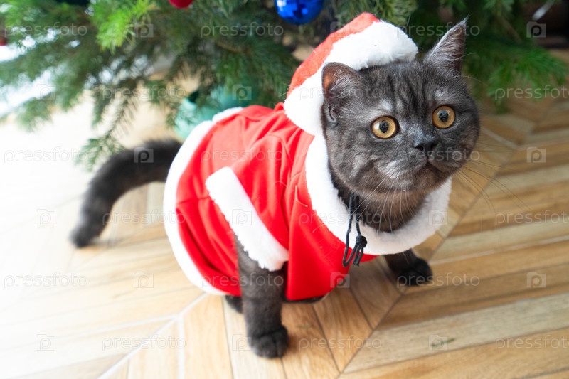Красивый серый кот, носящий праздничную шляпу Санты среди красивых украшений сезона
