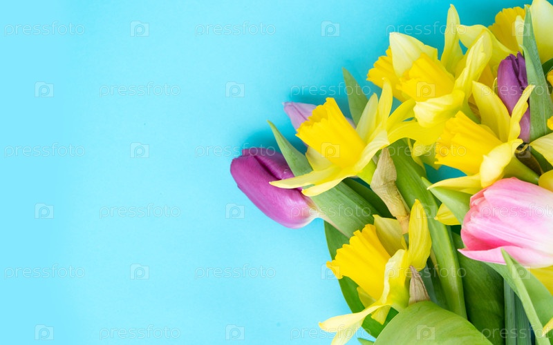 Тюльпаны и цветы нарцисса на синем фоне