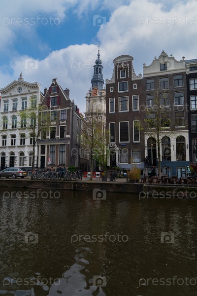 Фасады старых исторических домов и деревьев над водой канала, Амстердам, Нидерланды