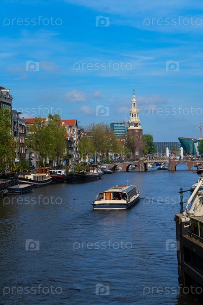 Фасады старых исторических домов и Монтелбансторен над каналом, Амстердам, Нидерланды