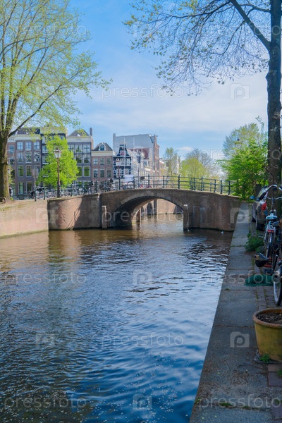 Фасады старых исторических домов и деревьев над водой канала, Амстердам, Нидерланды