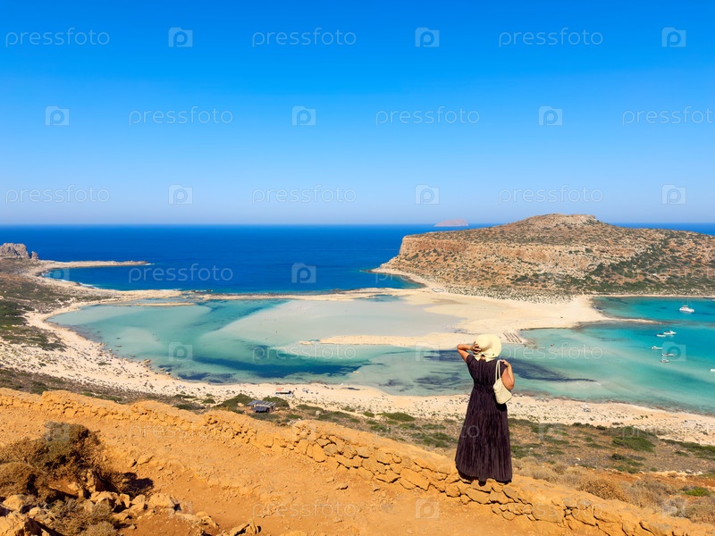 Женщина смотрит на прекрасную природу пляжа Балос, Крит, Греция