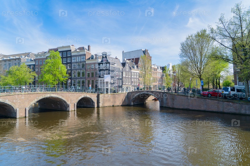 Фасады старых исторических домов и деревьев над водой канала, Амстердам, Нидерланды