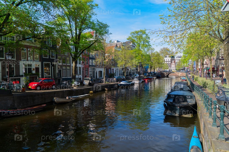 Фасады старых исторических домов и деревьев над водой канала, Амстердам, Нидерланды