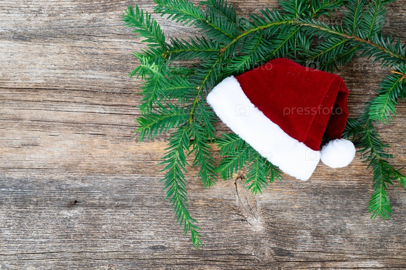Красочный рождественский образ жизни - вечнозеленая ветвь, украшенная шляпой Санты-Клауса на старом деревянном фоне
