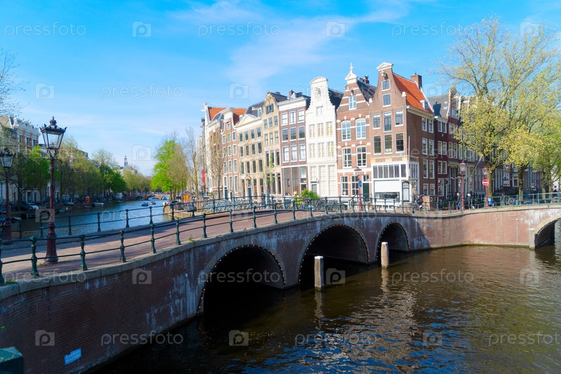 Фасады старых исторических домов и деревьев над водой канала, Амстердам, Нидерланды