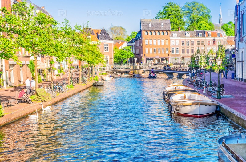 Исторические мосты и каналы с лодками в старом историческом городе Лейден, Нидерланды